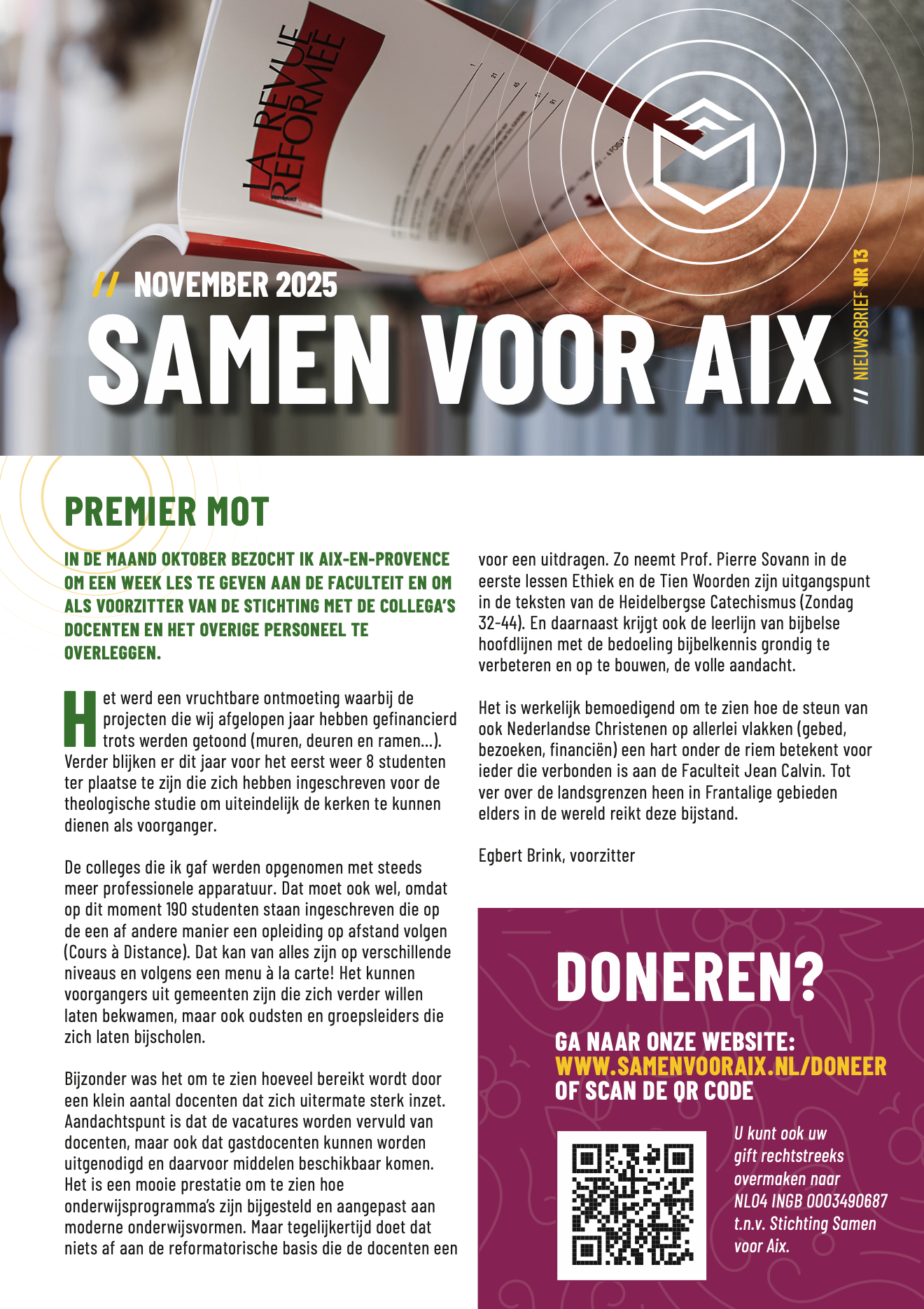 Van tijd tot tijd geeft stichting ‘Samen voor Aix’ een nieuwsbrief uit. U kunt onze nieuwsbrief aanvragen door een emailtje te sturen naar onze secretaris. Dan sturen we u in de toekomst onze nieuwsbrief geheel vrijblijvend toe.